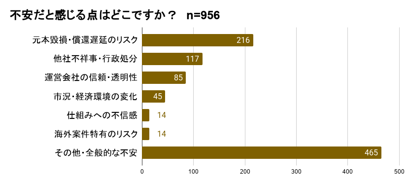 特に多かったのは、「元本毀損や償還遅延への不安(22.6%)」「他社不祥事や行政処分に関する報道(12.2%)」「運営会社の信頼や透明性(8.9%)」といったご懸念です。