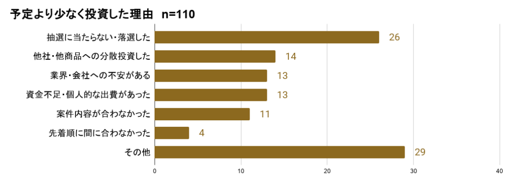 予定より少なく投資したと回答された皆さまからは、最も多かった理由として「抽選に当たらない・落選した(23.6%)」が挙げられました。そのほか、「他社・他商品へ分散投資した(12.7%)」や「業界・会社へ不安がある(11.8%)」といった声も寄せられています。
