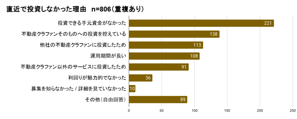 今年に入ってTECROWDへの投資を見送った方に理由を伺ったところ、最も多かったのは「投資できる手元資金がなかった(27.4%)」でした。次いで「不動産クラウドファンディングそのものへの投資を控えている(17.1%)」「運用期間が長い(13.4%)」といった回答が多く、TECROWDや不動産クラウドファンディングに対する率直なご意見も寄せられています。