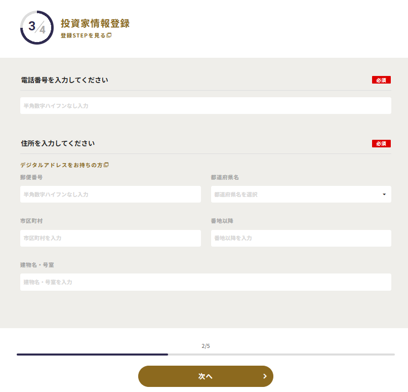 電話番号、住所(郵便番号、都道府県名、市区町村、番地以降、建物名・号室)を入力し、「次へ」をクリックします。
