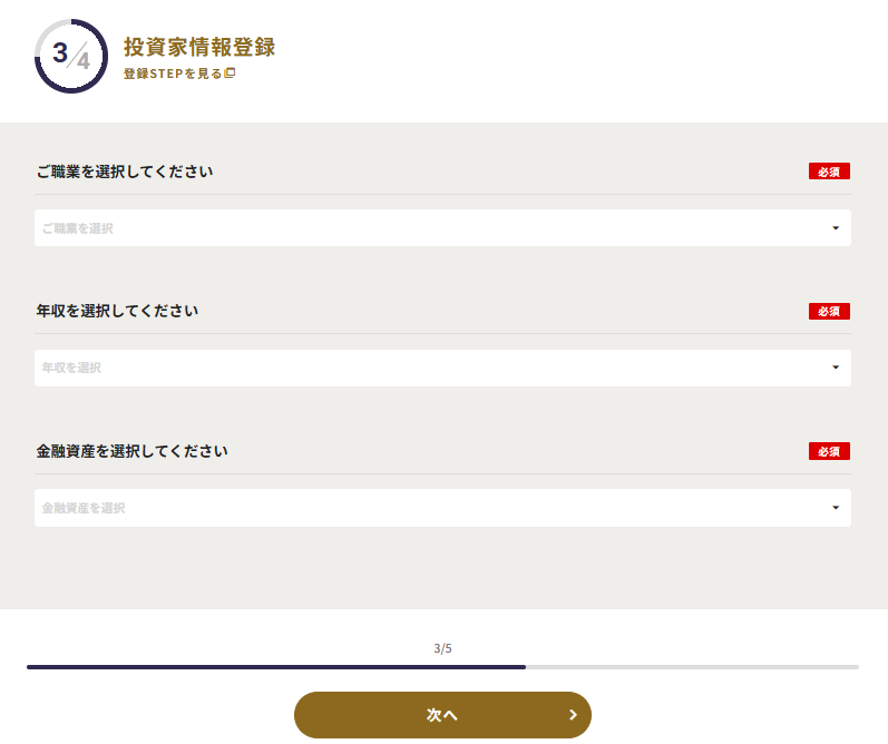 ご職業、年収、金融資産をリストより選択し、「次へ」をクリックします。