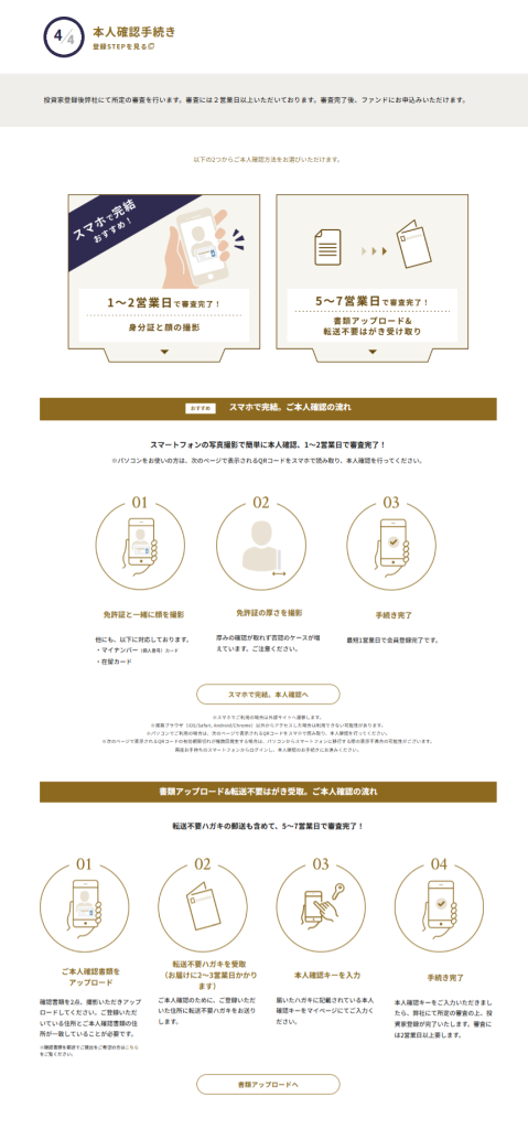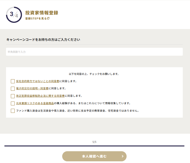 利用規約、反社会勢力ではないことの同意書、個人情報保護方針、電子的交付の説明・同意書、改正犯罪収益移転防止法に関する同意書、元本棄損リスクのある金融商品、ファンド購入資金の目的についてご確認のうえ、すべてのチェックボックスをチェック後、「本人確認へ進む」ボタンをクリックします。