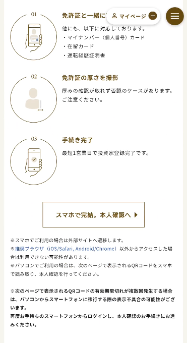 「スマホで完結。本人確認へ」をクリックし、お手持ちのスマートフォンで本人確認を行います(PCの方は表示されたQRコードをスマートフォンで読み取ってください)。