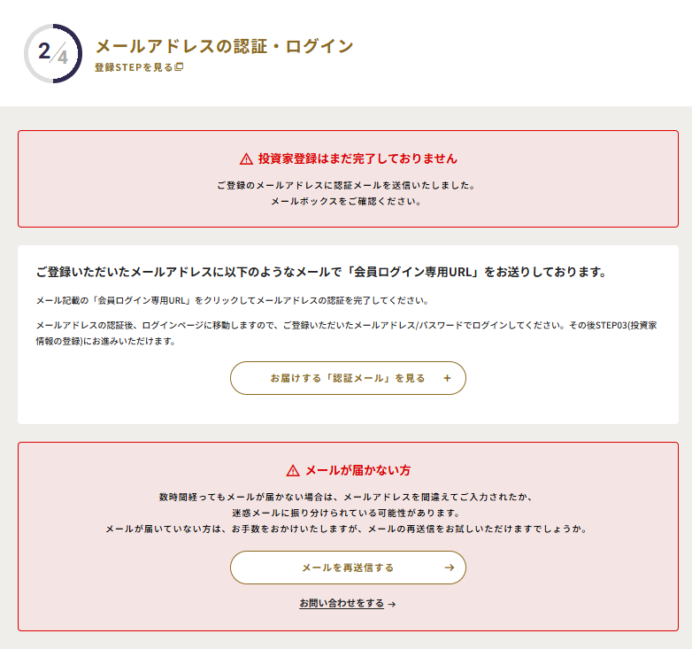 「STEP2へ進む」をクリックしますと、下記画面が表示され、登録いただいたメールアドレスへ会員ログイン専用URLをご案内するメールが送信されます。