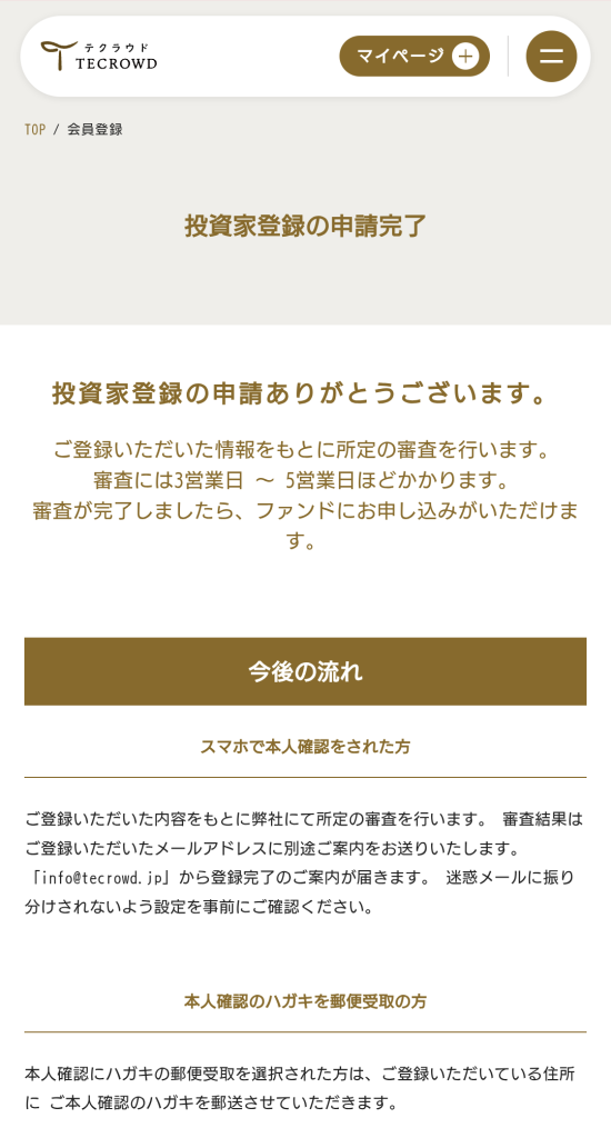 本人確認が完了し、以下の画面が表示されますと申請は完了となります。