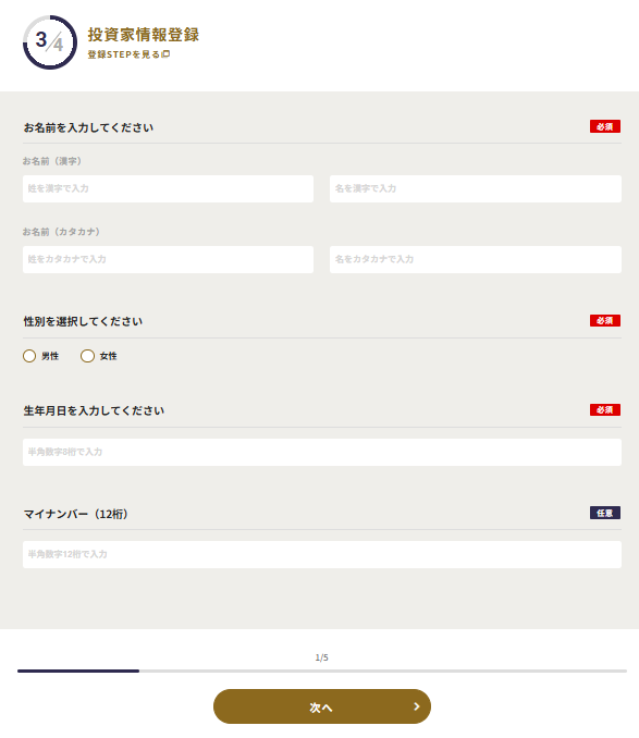お名前(漢字)、お名前(カタカナ)、性別、生年月日(半角)を入力し、「次へ」をクリックします。