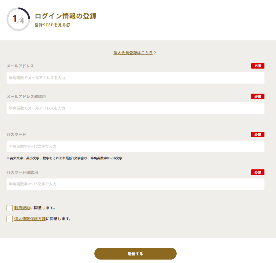 新規会員登録ページへアクセスし、ログイン時に利用いただくメールアドレス、パスワードを入力、利用規約と個人情報保護方針をご確認のうえ、チェックボックスをチェック後、「送信する」ボタンをクリックします。