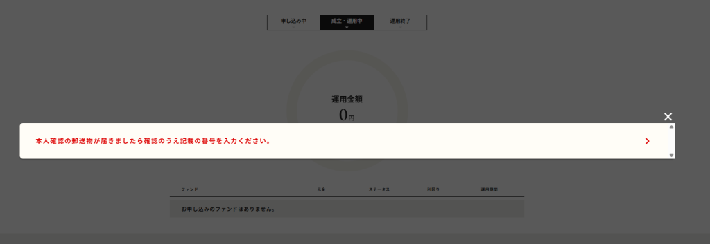 マイページにログインし、下記画面のメッセージ「本人確認の郵送物が届きましたら確認のうえ記載の番号を入力ください。」をクリックします。