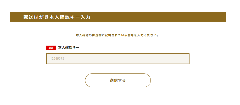 お手元に届いた「転送不要はがき」に記載の本人確認キーを入力し、「送信する」をクリックします。