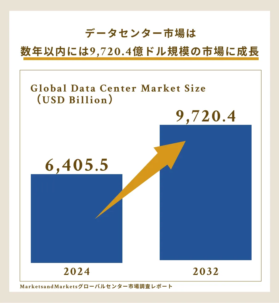 世界のデータセンター市場は急成長中で、2024年の約6,400億ドルから2032年には9,700億ドルへと拡大することが予測されています。