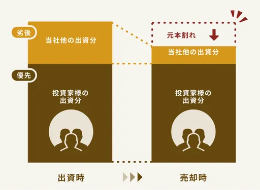投資家の皆様にご出資いただく優先出資に加え、当社および当社が指定する者が劣後出資を行っており、本ファンドの償還時に元本割れが発生した場合は、劣後出資者が先に損失を負担します(劣後出資の比率については、リターン項目をご確認ください)。損失が劣後出資者の出資額を超えた場合にのみ、投資家の皆様の元本が毀損する可能性があります。